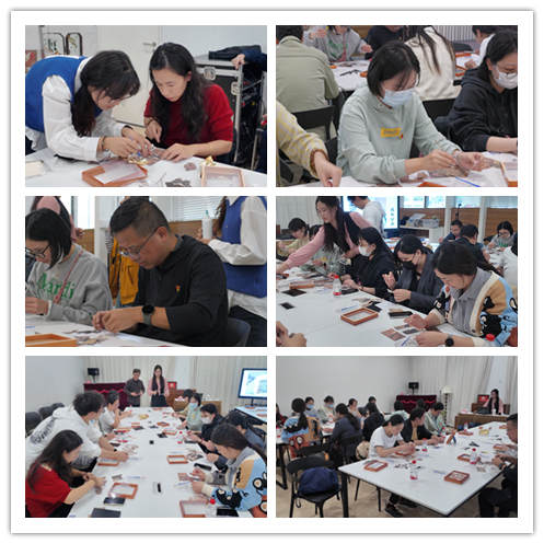 随后,活动进入了别开生面的“古艺新承 繁中有序”传统工艺“锦灰堆”审美实践环节。在专业老师的讲解和指导下,党员们纷纷动手实践,通过拼贴、描绘等方式,亲身体验了这一古老技艺的魅力。在创作过程中,财务工作所强调的严谨、精确与艺术创作所需的想象力、美感相互碰撞、彼此启发,现场气氛热烈,佳作频出。